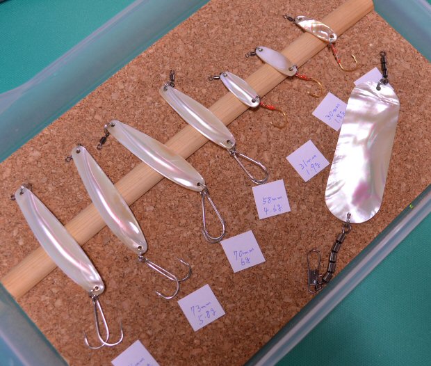 (FAQ446) 解禁の準備4 すでに、多くの湖では解禁を迎えました。 皆さま、釣果はいかがでしょうか? 私も行かねばならないと思いつつ、忙しくて・・・ それで、さらにいろいろ作ってみました。 下から、夜光貝キビナゴ筋S字76㎜~58㎜4本、 夜光貝キビナゴ筋超ミニマムサイズ31㎜、 ピンクマッセル30㎜、日本アワビ超トラ目30㎜。 右は、フラッシャードジャー夜光貝キビナゴ筋90㎜。 それぞれ、アクションも完璧です。 Shopとにアップしています。