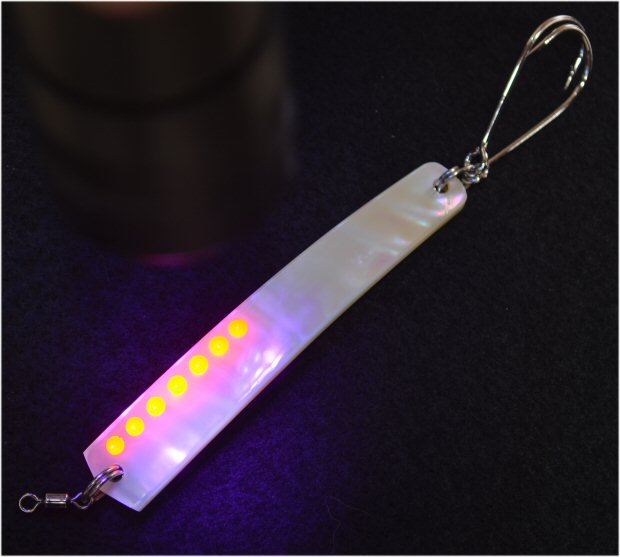 ルアーは、ウイングスリム夜光貝のタトゥーUV蛍光オレンジ72㎜と、