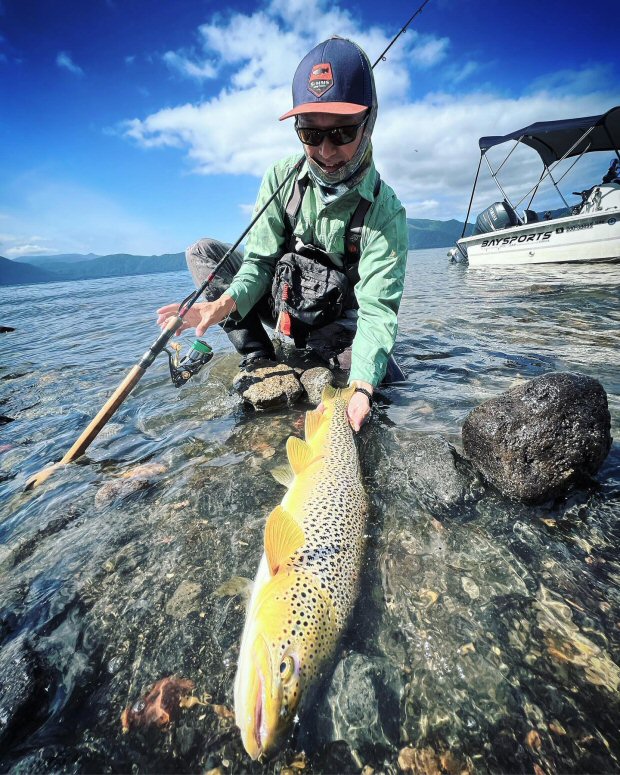 16センチのプラグに食らいつく大型のプラチナブルーバック。 湖水と同じくどこまでも深いブルーの美しさは写真では撮り切る事は出来ない。