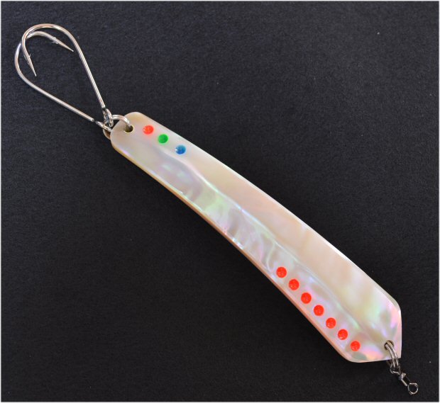 I'zShellCraftドルフィン夜光貝ツノ部タトゥーUV蛍光赤レインボー。 アメリカミシガン湖で果てしない釣果を上げています。