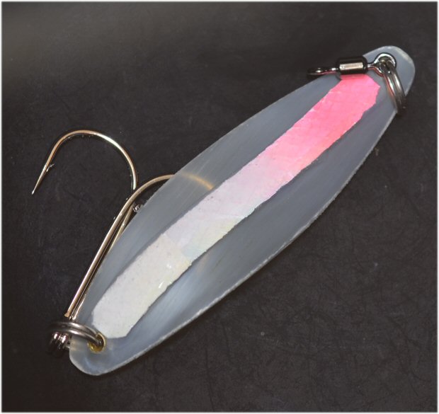 (FAQ614) ドールシープのシェルキール 透明性が非常に強いドールシープのセンターにシェルのキールを設けています。 写真は水中写真で、ドールシープのウイングはほぼ透明に見えます。 シェルキールのヘッドは蛍光赤、全体には紫外線で発光する超ケイムラを塗布しています。 このシェルのキールによって重心が下がり、 シェルスプーンに近いアクションで、スライドを交えたウォブリングをすることができます。