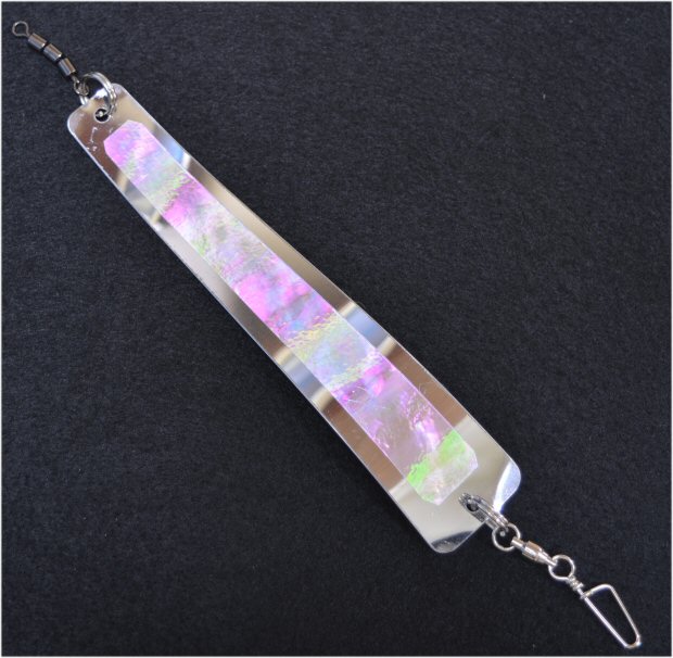 (FAQ618) Slimfish Dodgerアワビピンク・ホログラム 実物を見たら驚きます。 赤い日本アワビに驚くほどそっくりなカラーです。 これはもう釣るしかないでしょう。 直接フックを取り付けて、ルアーとして使用するのもお勧めです。 125㎜に150㎜を追加しました。